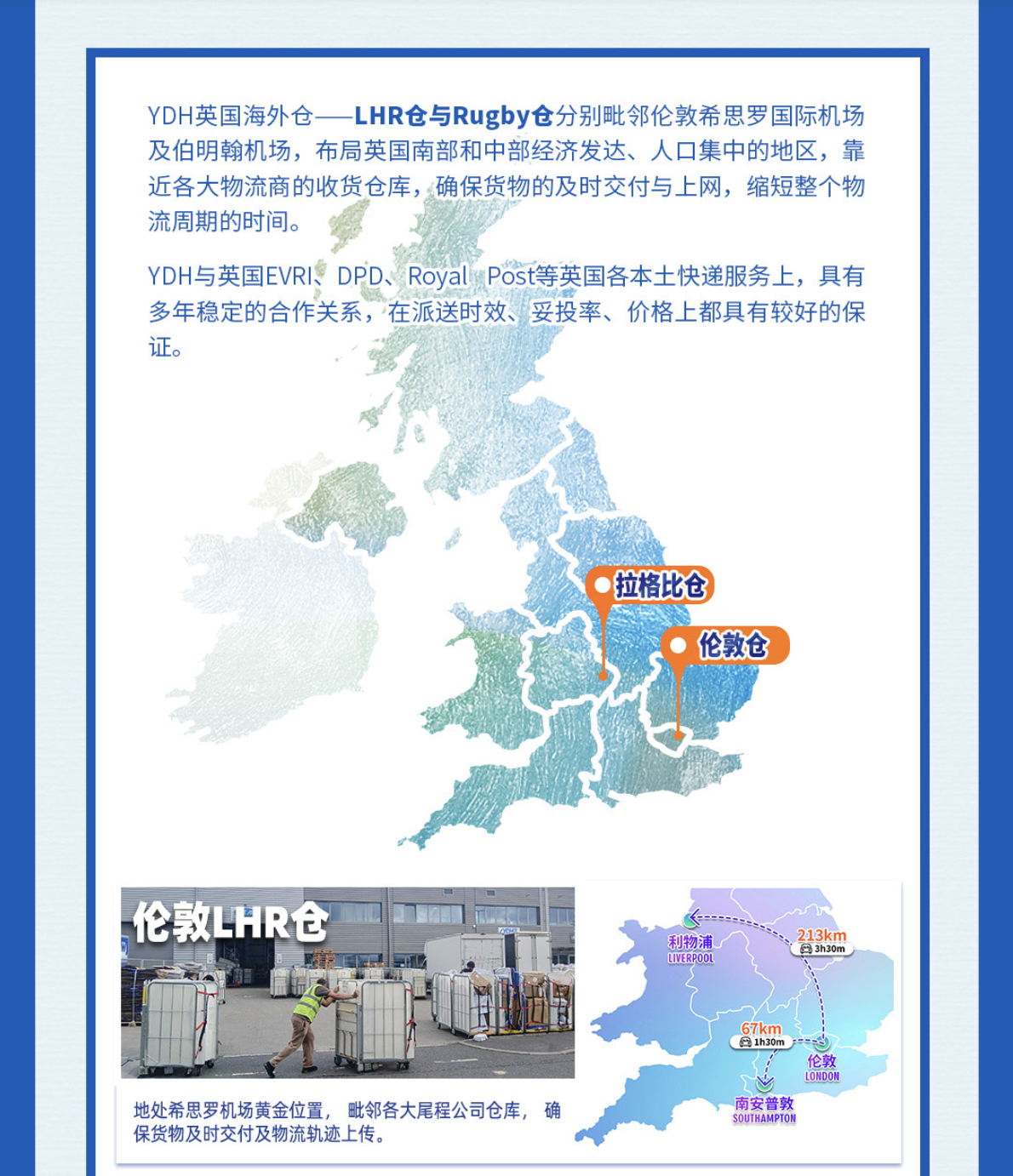 Entrega local: YDH cuenta con alianzas sólidas y duraderas con diversos servicios de mensajería locales del Reino Unido, como EVRI, DPD y Royal Post, lo que garantiza una buena velocidad de entrega, un alto índice de éxito y precios competitivos.