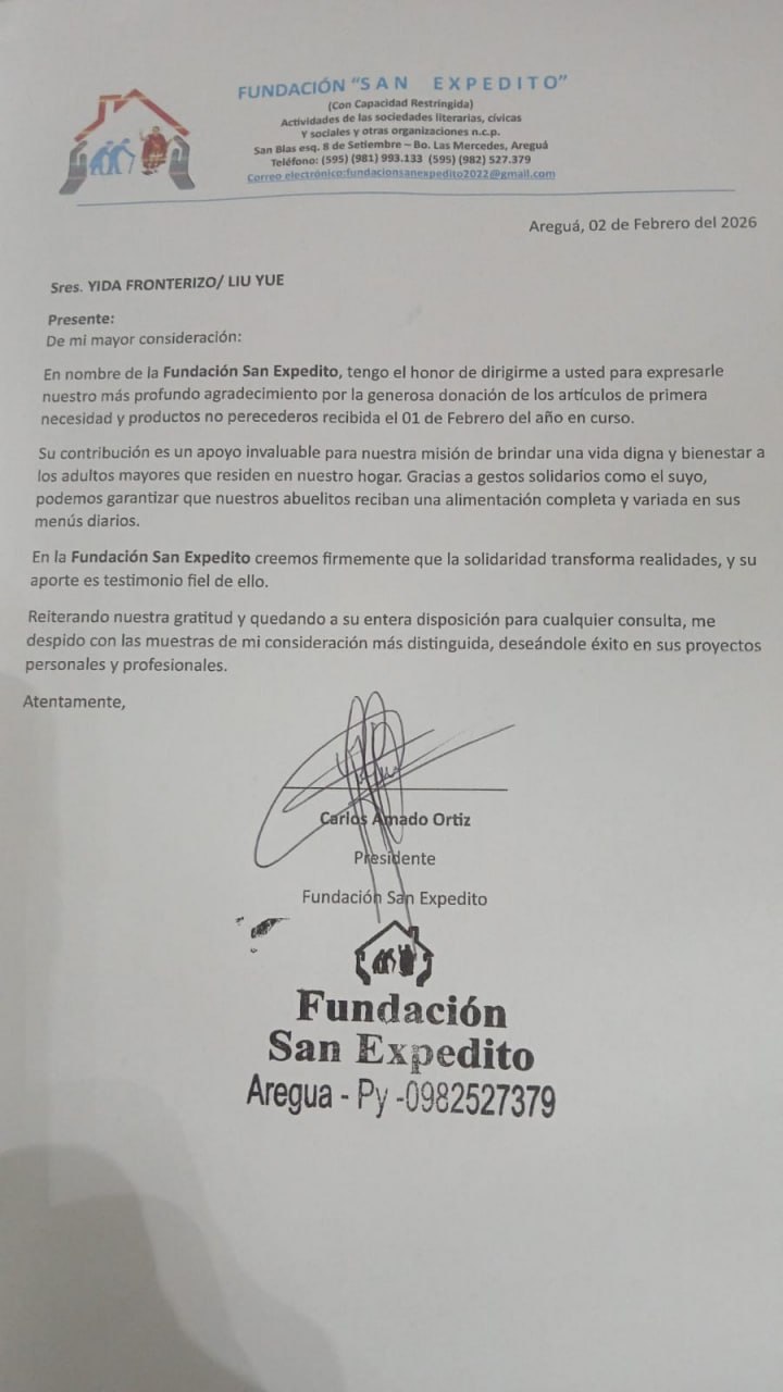 Una carta de agradecimiento transmite reconocimiento, encarna calidez y demuestra un sentido de responsabilidad. Yida Cross-border Logistics siempre ha integrado estrechamente su desarrollo corporativo con el bienestar social, poniendo en práctica la filosofía corporativa de "devolver a la sociedad lo que recibe de ella". Esta carta de agradecimiento no solo resume la labor filantrópica pasada de la empresa, sino también una expectativa para sus futuras iniciativas filantrópicas. De cara al futuro, Yida Cross-border Logistics se mantendrá fiel a sus aspiraciones originales y seguirá adelante, profundizando su negocio principal de logística transfronteriza y expandiéndose a los mercados globales, dedicándose continuamente al bienestar público, difundiendo calidez con amor y cumpliendo con sus responsabilidades, permitiendo que la filantropía florezca en Paraguay y más allá.