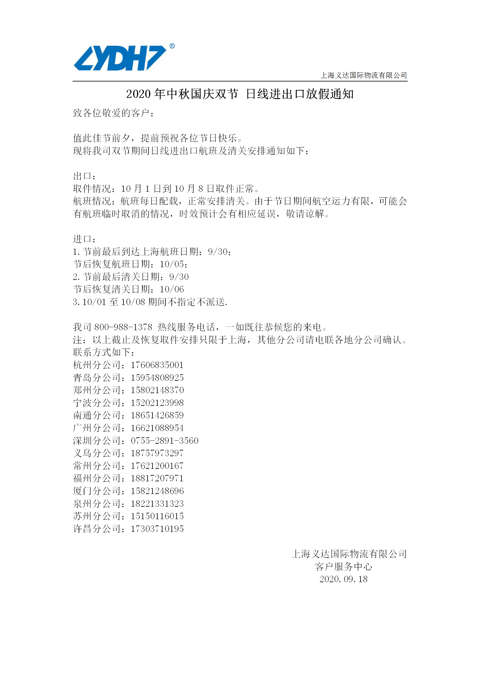Aviso diario de importación/exportación de 2020 sobre el Festival del Medio Otoño y el Día Nacional