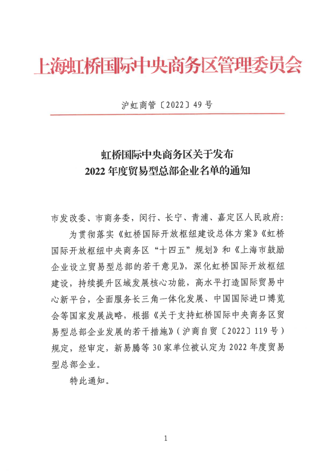 Según el documento "Varias medidas para apoyar el desarrollo de empresas con sedes comerciales en el distrito comercial central internacional de Hongqiao" (Oficina Municipal de Comercio de Shanghai [2022] No. 119), tras la recomendación de varios distritos y la revisión de expertos, y la aprobación del Comité del Partido del Comité de Gestión del Distrito Comercial Central Internacional de Hongqiao, 30 empresas han sido reconocidas como sedes comerciales.